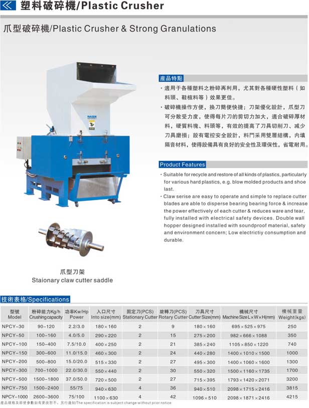適用于各種逆料之粉碎再利用,尤其對(duì)各類(lèi)硬性塑料(如料頭,鞋楦料等)效果更佳。NPCY系列破碎機(jī)操作方便,換刀簡(jiǎn)便快捷;刀架優(yōu)化設(shè)計(jì),爪型刀可分散受力度,便得每片刀和剪切力加大,適合破碎厚材料,硬質(zhì)料塊,料頭等,有效的提高了刀具切削力,減少刀具磨損;設(shè)有電控按全設(shè)計(jì),料頭采用雙層結(jié)構(gòu),內(nèi)填隔音材料,使得設(shè)備具有良好的安全性及環(huán)保性,省電耐用。